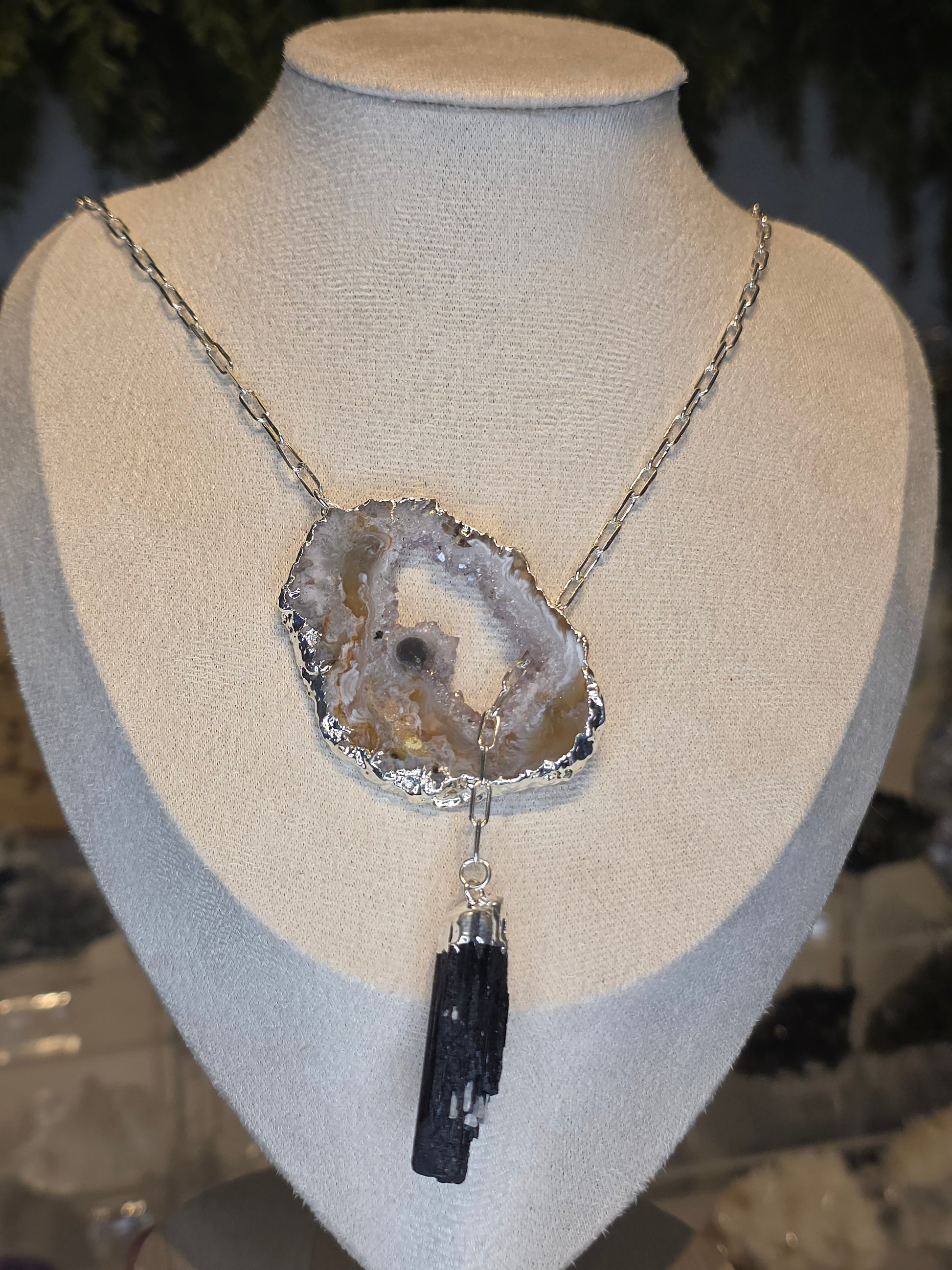 Silver Plated Druzy Brazilian Agate Necklace with Black Tourmaline Drop B